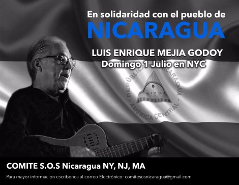 On July 1st, Luis Mejia Godoy will be doing a benefit concert in New York City. A fundraiser to help people struggling through the unrest. Sunday, July 1 at 6 pm at West Park Presbyterian Church, 165 West 86th Street, NY