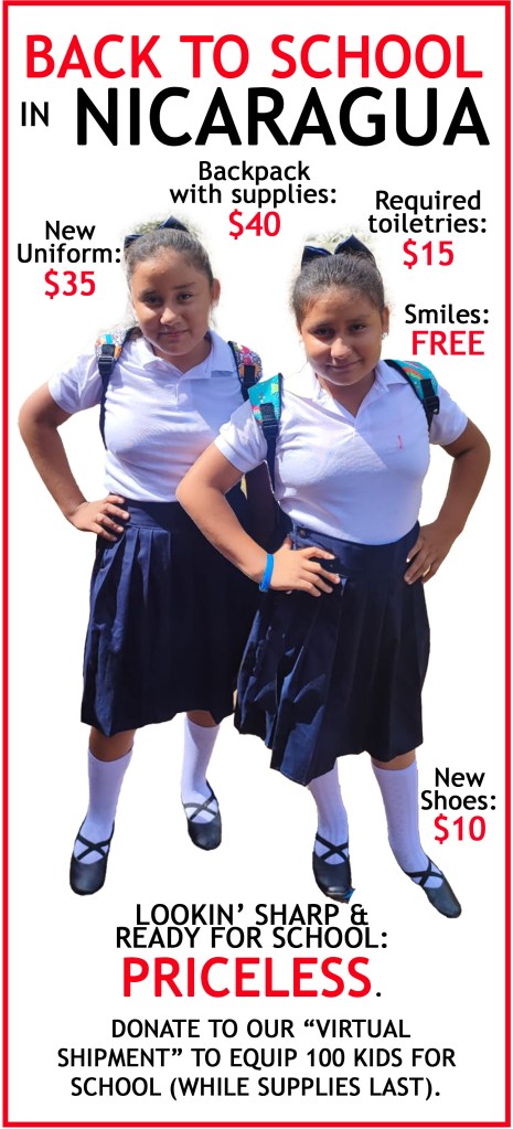 As all of the parents up here were getting their kids for another school year, the PeaceWorks community came together to equip children from the Inhijambia Program for Street Kids for school down there. In the past we physically sent school supplies down on shipping containers. In July we launched a “virtual shipment” campaign to raise money to buy backpacks, uniforms, shoes, school supplies, toiletries and everything else the kids in Nicaragua will need for school. By mid August we raised $10k to equip as many kids as we can for a successful year of learning.
